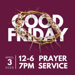 Come pray any time between noon and 6pm. The church will be open with interactive prayer stations. This solumn prayer time is open to all and accessible for families. Our solumn prayer service is at 7pm. Children’s Ministry will be available.